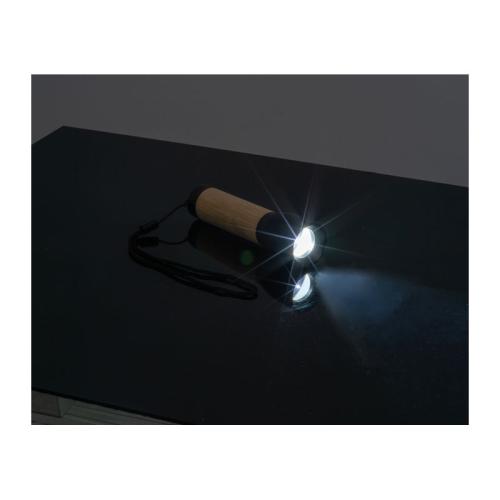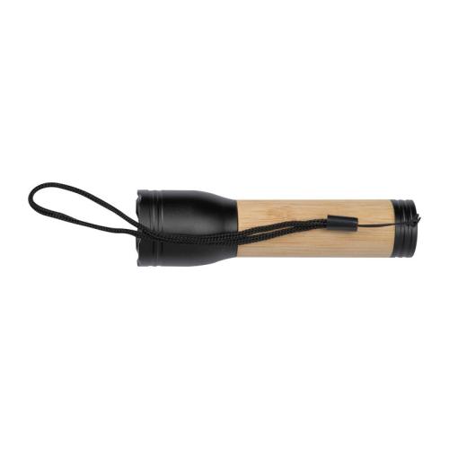 Rechargeable torch made from recycled aluminium with bamboo handle with 400 lumen brightness and a battery capacity of 300 mAh. Type C charging cable included.