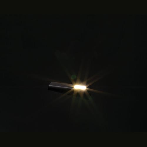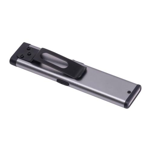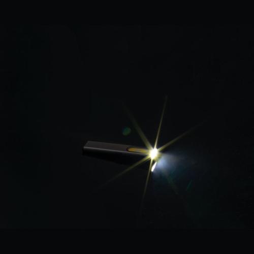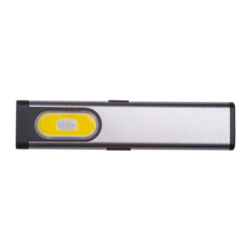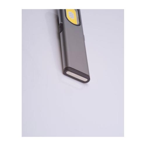 Rechargeable flashlight (450 mAh) made of recycled aluminum with side COB light (160 lumens) and front light (80 lumens), clip, and magnetic end. Includes charging cable.
