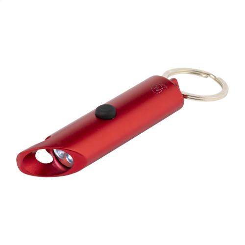 Mini, recycled aluminium flashlight with 3 LED, bottle opener and keyring. With button cell battery.