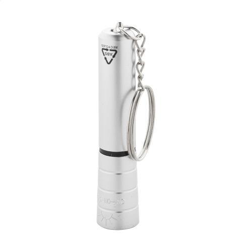 Recycled ABS plastic, mini flashlight with 1 LED, metallic finish and metal keyring. With button cell battery.