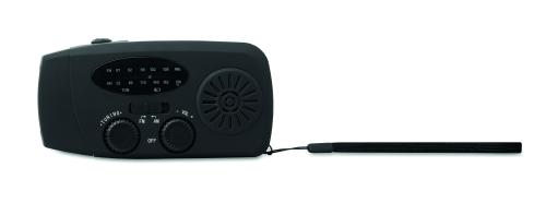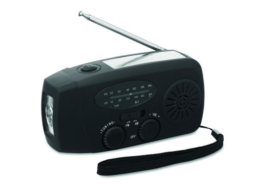 Portable AM/FM radio in ABS with LED Torch (2 settings) and a 1200mAh Power bank for emergency charging. Self powered by solar and hand crank.