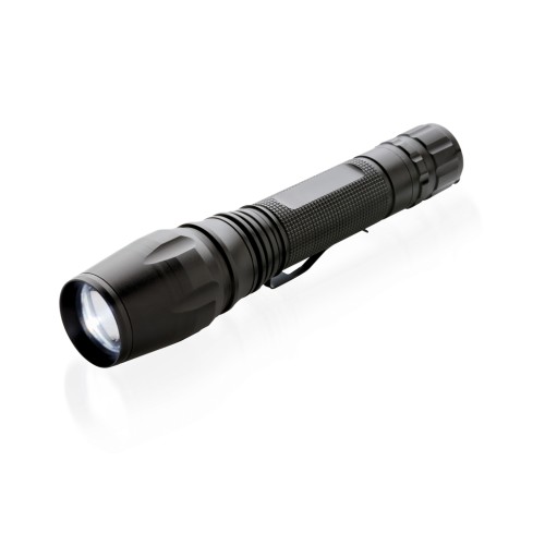 Super bright and tough 10W CREE led torch that can handle even the most difficult conditions. The durable aluminium torch is IPX 4 waterproof and shockproof up to 1 metre drop. The beam of the torch can be adjusted to focus or to light up a bigger area. With belt clip for carrying the torch. 250 lumen and working time of 6 hours. Includes batteries for direct use.