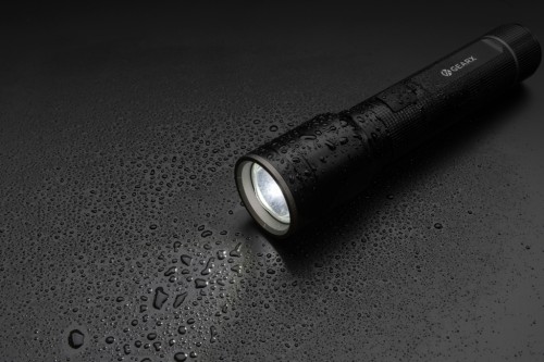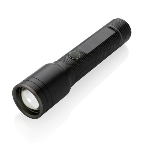 Functionality, performance and design all come together in this re-chargeable 10W torch made with RCS certified recycled aluminium. Total recycled content: 20% based on total item weight. RCS certification ensures a completely certified supply chain of the recycled materials. Because of its IP4 rating, it is weatherproof so can easily be taken outside. The powerful bulb creates up to 1500 lumen and a beam that reaches up to 800 metres. The torch uses a re-chargeable A-grade battery so no need to replace the batteries. Simply re-charge via your USB socket and the included RCS certified recycled type C cable. The high quality bulb comes with 5 modes including SOS function. The 4000mAh battery allows a usage up to 10 hours on a single charge and allows charging your mobile devices via type C. Aluminium does not lose its characteristics in the recycling process and can be recycled endlessly. Item and accessories 100% PVC free. Packed in FSC mix packaging. Input Type-C 5V, 1A; Output 5V, 1A