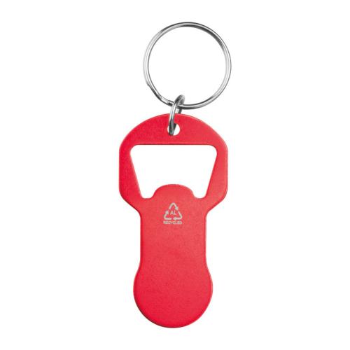 Keychain made of recycled aluminum with integrated bottle opener and shopping cart token. Lightweight, practical, and ideal for everyday use.