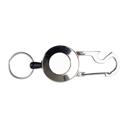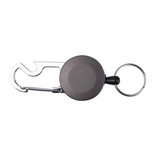 Retractable metal keychain with transparent card holder and matel carabiner featuring a bottle opener. The key ring extends up to 55 cm with a retractable reel effect.