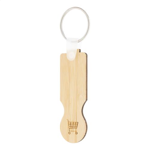 Metal carabiner keyring with full colour printed plywood shopping trolley coin. Price includes UV LED printing on one side. Coin size: ø23×2 mm. MOQ: 200 pcs.