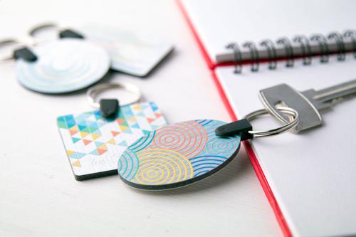 Oval shaped, brushed aluminium composite keyring with full colour printing. Price includes UV LED printing on one side. MOQ: 100 pcs.