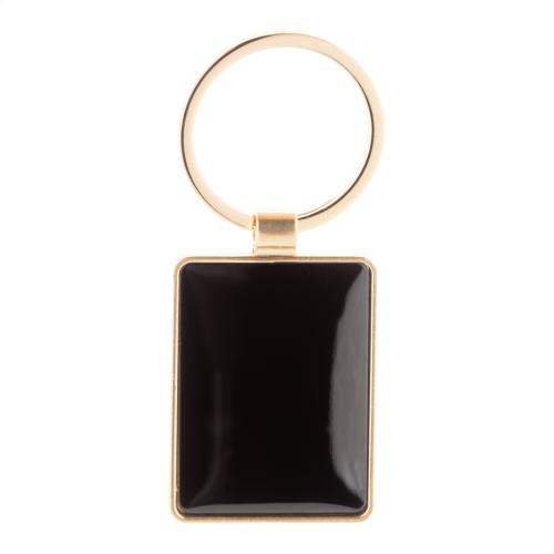 Rectangular shaped metal keyring in golden finish with gunmetal plate. In kraft paper box.
