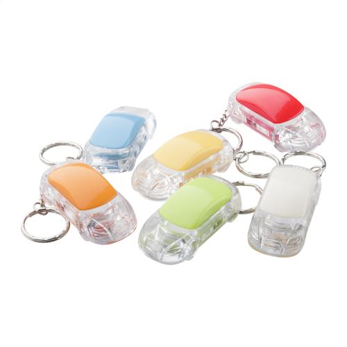 Car shaped plastic keyring with white LED flashlight and metal ring. With button cell battery.