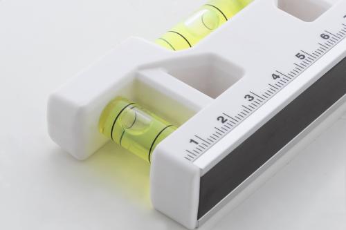 Multifunctional, recycled ABS keyring with metal ring, ruler, magnet and dual spirit levels.