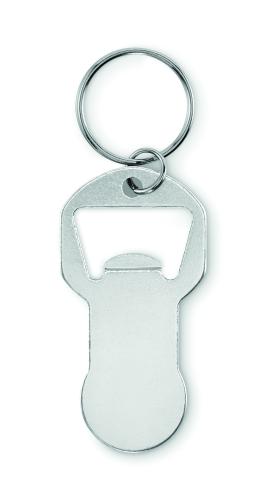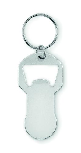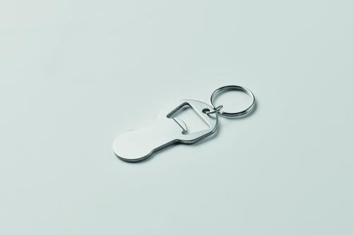Bottle opener token keyring made of recycled aluminium with iron ring.