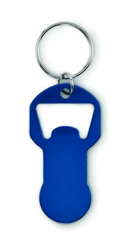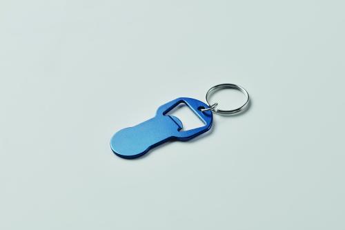 Bottle opener token keyring made of recycled aluminium with iron ring.