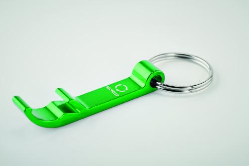 Recycled aluminium key ring bottle opener in shiny finish.