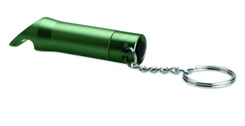 Metal LED torch key ring with bottle opener. 3 cell batteries included.