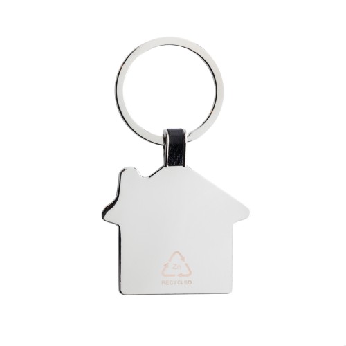 House shaped keychain made from RCS recycled zinc alloy. Total recycled content: 84% based on total item weight. RCS certification ensures a completely certified supply chain of the recycled materials. Packed in paper bag.