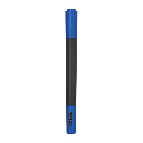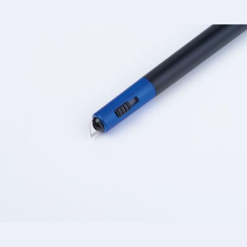 2-in-1 cutter with felt tip pen made of plastic. The pen writes in the color of the cap.
