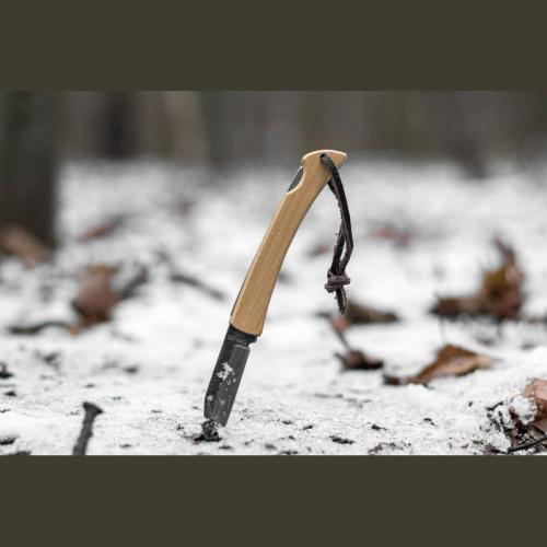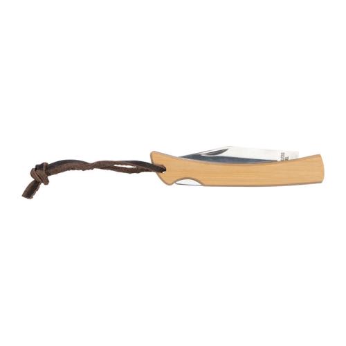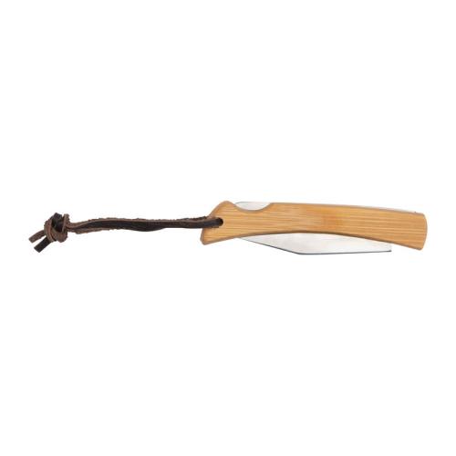 Stainless steel pocket knife with bamboo grip zone, safety lock and a hanging loop.