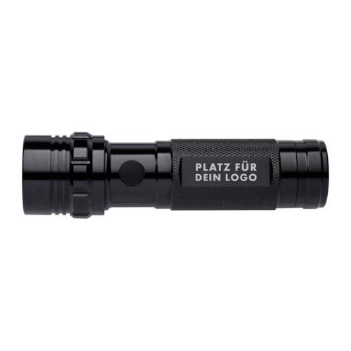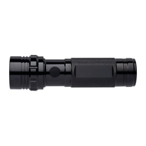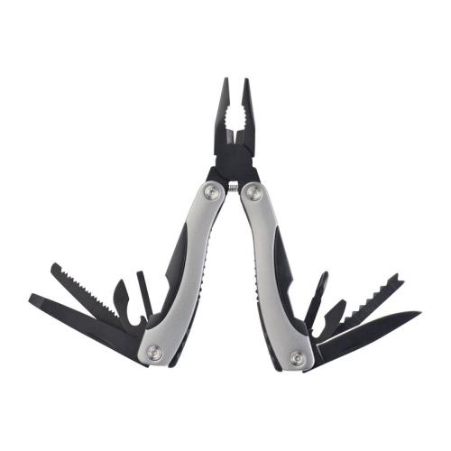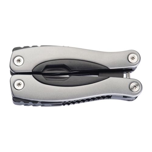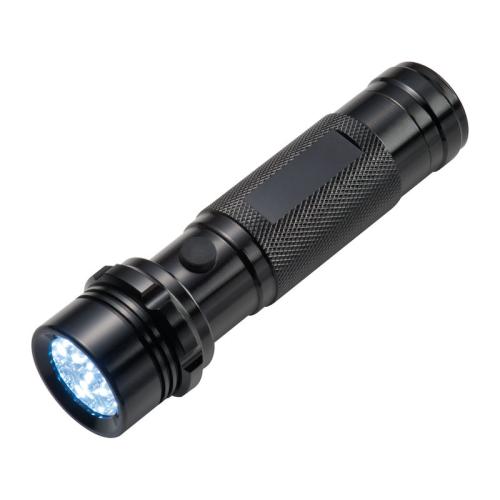Set of large metal torch with 14 LEDs and multi-tool with pincers, saw, can opener, nail file, large and small slotted screwdriver, Phillips screwdriver, extra sharp knife, and fish scaler with measuring unit.