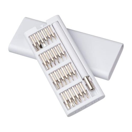 Screwdriver set with 24 magnetic precision slotted and cross bits made of stainless steel and holder in a plastic packaging to slide on.
