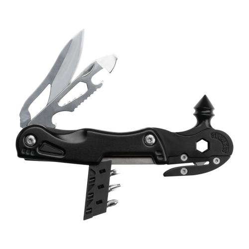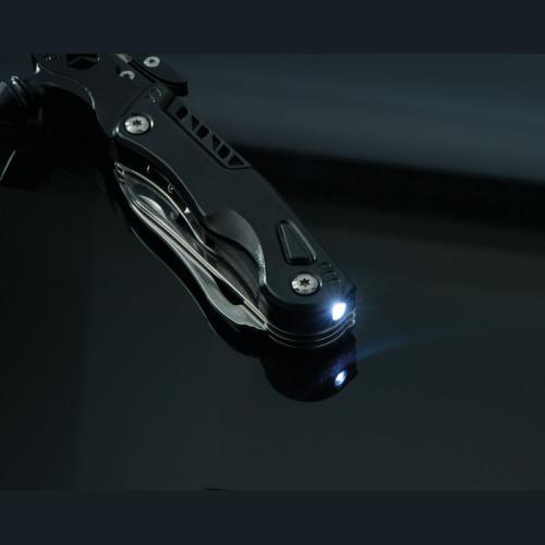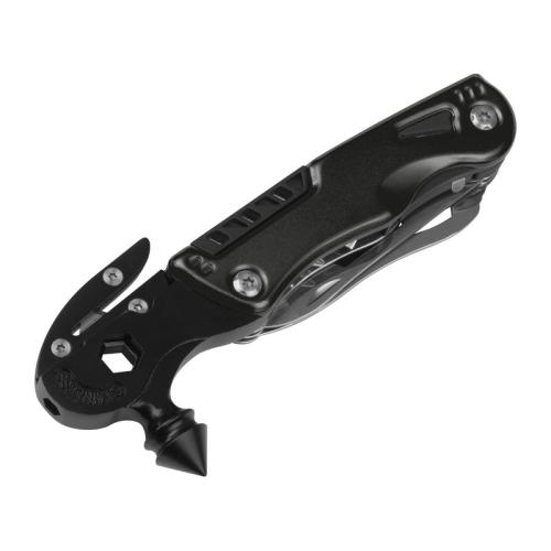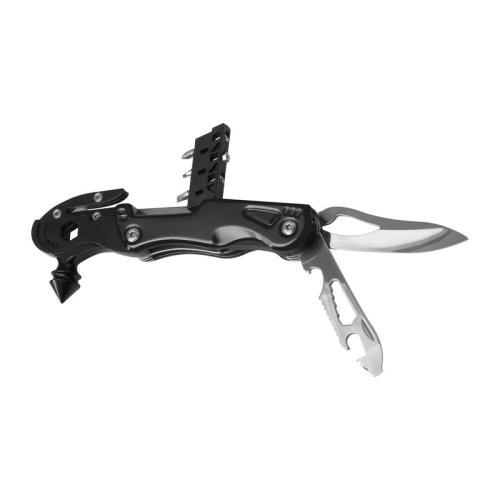 Multitool made of metal with the following functions: LED light, emergency hammer, belt cutter, screwdrivers, knife, bottle opener, saw and wrench, packed in a case.