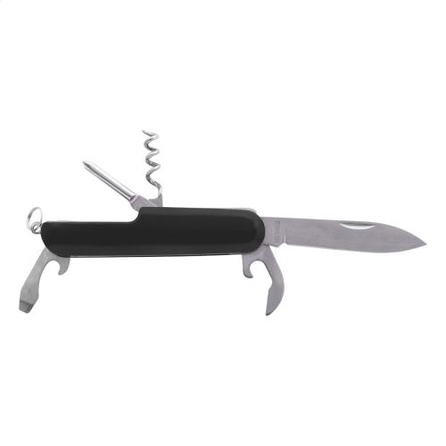 Stainless steel pocket knife with 5 functions and aluminium handle.