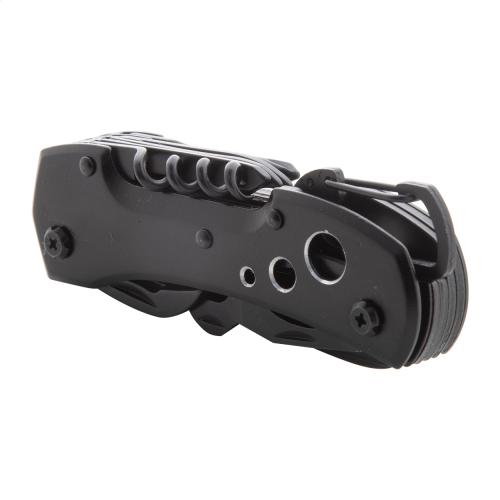 All black, stainless steel pocket knife with 13 functions, carabiner and aluminium handle.
