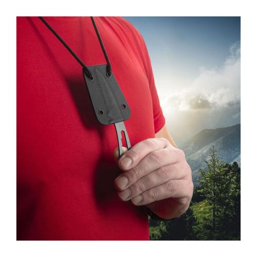 Multifunctional Schwarzwolf knife in a case with a cord. The multifunctional knife handle can be used as a bottle opener and wrench holes for tightening a nuts. The cord includes an orange whistle. The case is made of special plastic alloy Kydex. Packed in a Schwarzwolf gift box.