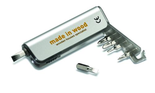 Multi-tool holder and LED torch in ABS casing with metallic finish. Includes 6 different interchangeable screwdriver heads. 3 cell batteries included.