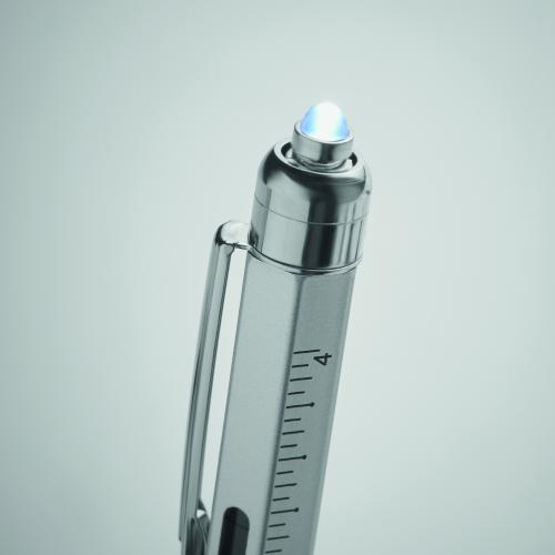 Twist action spirit level pen in stainless steel with ruler, stylus and Phillips head and flat head screw driver bits and LED. 3 AG batteries included. Blue ink.