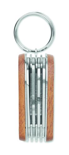 Stainless steel multi tool pocket knife with acacia wooden handle. 7 functions: bottle opener, knife, can opener, file, screwdriver bits, key ring and 1 LED light. 3 button cells included.