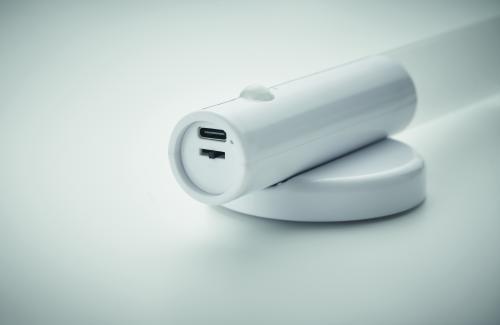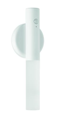 Emergency sensor torch light in ABS and acrylic with magnetic base. Built-in 300 mAh rechargeable battery and charging cable. Base can be mounted on the wall with included 3M sticker.