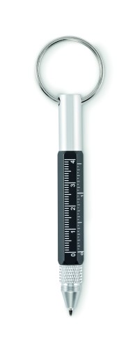 Key ring with twist action pen in recycled aluminium with 4cm/ 1,5 inch ruler, stylus and 2 in 1 phillips and flat head screw driver. Black ink.