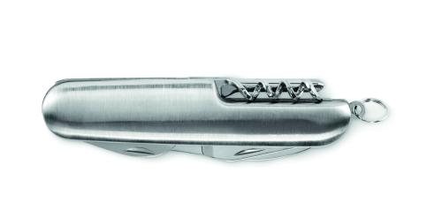 Recycled aluminium multi-function pocket knife. 5 functions: large blade, bottle opener, screwdriver, corkscrew and can opener