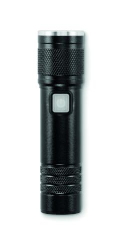 Rechargeable and expandable COB light torch in recycled aluminium. 100 lumen with 3 light settings and zoom function. Built-in 800 mAh rechargeable battery. Charging cable included.