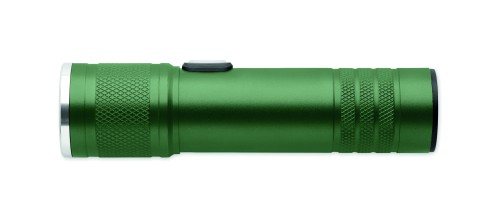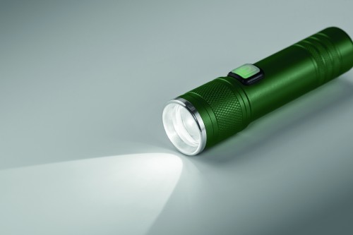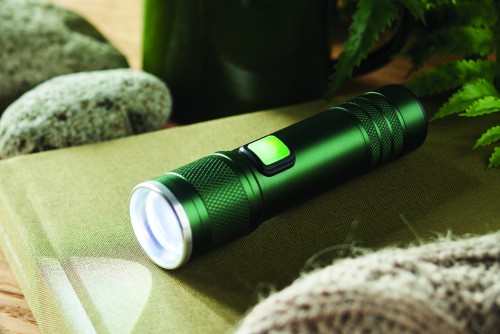 Rechargeable and expandable COB light torch in recycled aluminium. 100 lumen with 3 light settings and zoom function. Built-in 800 mAh rechargeable battery. Charging cable included.