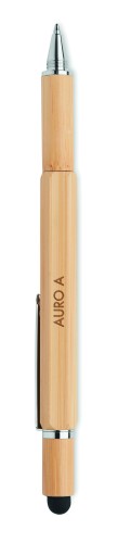 Twist action spirit level pen in bamboo with 7 cm ruler, stylus and Phillips head and flat head screw driver bits. Blue ink. Bamboo is a natural product, there may be slight variations in colour and size per item, which can affect the final decoration outcome.