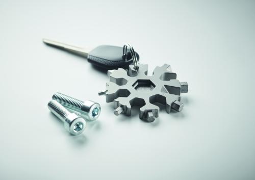 Multi-tool 17-in-1 stainless steel snowflake shaped. Optional metal ring included.