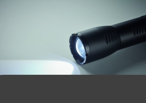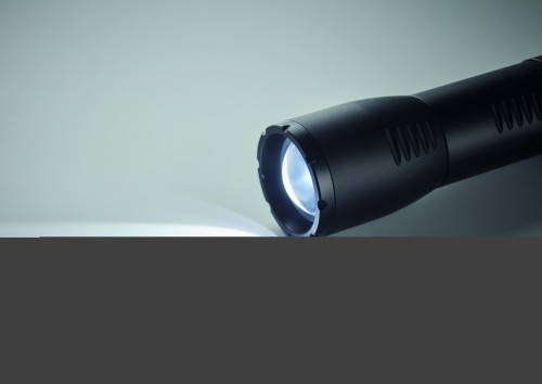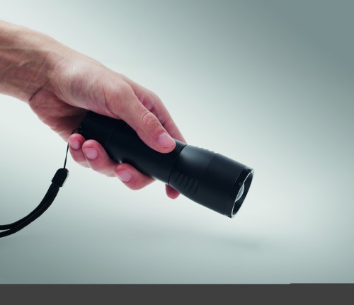 Small aluminium zoomable LED flashlight torch and detachable strap. Output: 200 lumen. 3 AA battery excluded.