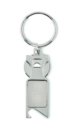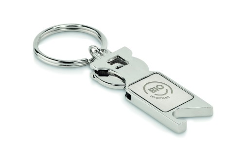 Zinc alloy key ring including euro trolley token and bottle opener.