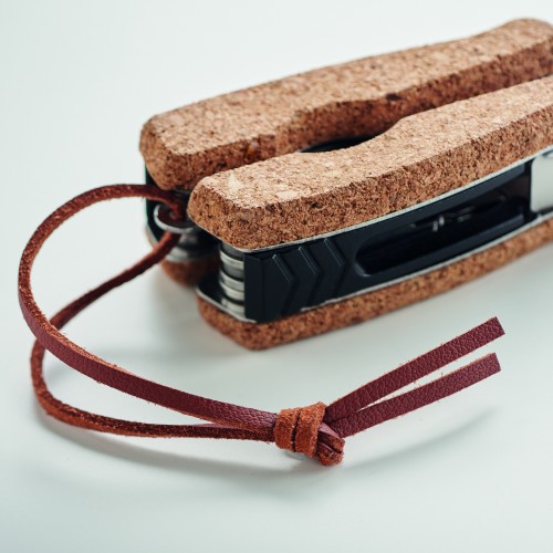 Stainless steel multi-function pocket knife with a cork cover and PU handle cord. 9 functions. It includes: Pliers, 2 openers, screwdriver with Philips bits, saw blades, knife, file and screwdriver with flat bit. Cork is a natural product, there may be slight variations in colour and size per item, which can affect the final decoration outcome.
