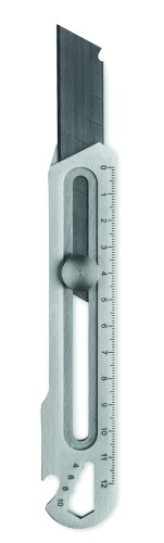Stainless steel retractable knife with 8 carbon steel blades, bottle opener, wrench and ruler.
