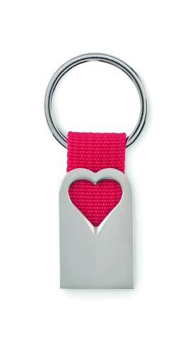 Metal key ring in matt pearl finish in hollow heart shape decoration with polyester webbing holding the metal ring. Individual gift box.