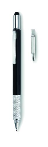 Twist action spirit level pen in ABS with ruler, stylus and phillips head and flat head screw driver bits. Black ink.