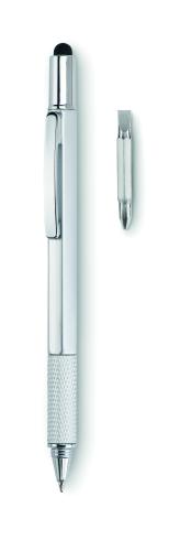 Twist action spirit level pen in ABS with ruler, stylus and phillips head and flat head screw driver bits. Black ink.