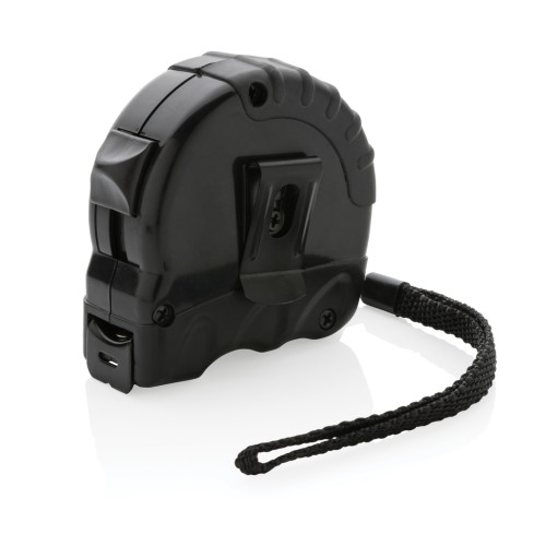 5 metre tape made with RCS (Recycled Claim Standard) certified recycled ABS. Total recycled content: 17% based on total item weight. RCS certification ensures a completely certified supply chain of the recycled materials. With deluxe TRP rubber grip for smooth grip. With release/lock button. With 19mm single sided tape, yellow with black carbon steel hook. With polyester wrist strap. Packed in FSC® mix kraft packaging