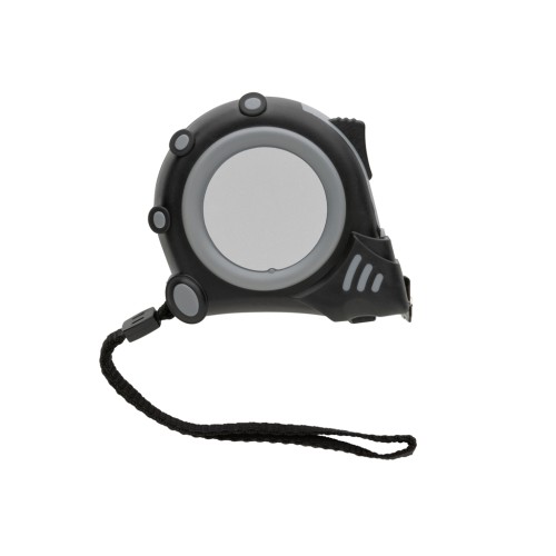 5 metre tape made with RCS (Recycled Claim Standard) certified recycled ABS. Total recycled content: 15% based on total item weight. RCS certification ensures a completely certified supply chain of the recycled materials. With deluxe TRP rubber grip for extra control. With release/hold button. With 19mm single sided tape, yellow with black carbon steel hook with two integrated magnets. With polyester wrist strap. Packed in FSC® mix kraft packaging