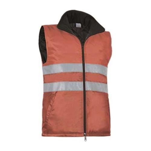 Outside waterproof fabric with polyurethane coating. Padded inside with lining 200 grs/m². Sewn retroreflective bands around the body. Central closure with double zip. Inside fleece neckband (more confortable). 2 lower pockets. Inside zip pocket. 10 units per box: 1 size, 1 color. Individual bag.