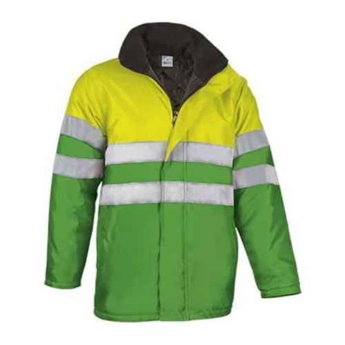 Outside waterproof fabric with polyurethane coating. Padded inside with lining 200 grs/m². Sewn retroreflective bands around the body and arms. Central closure with double zip. Central placket with snap fasteners. Fleece-lined collar (more confortable). 2 lower pockets. Inside zip pocket. Hood with adjustable drawstring hidden in neckband. Inside cuffs sleeves (more ergonomic). 10 units per box: 1 size, 1 color. Individual bag.