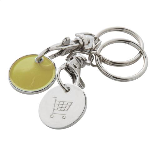 Metal keyring with shopping trolley coin. One side of the coin is painted, the other side has an engraved shopping trolley. Coin size: ø23×1,7 mm.