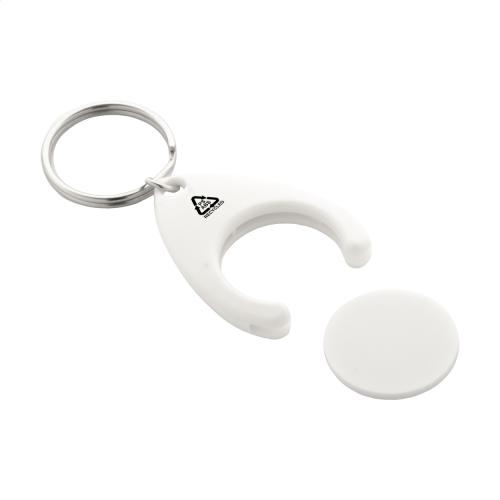 Recycled ABS and recycled PS plastic keyring with shopping trolley coin and metal ring. Coin size: ø24×2 mm.